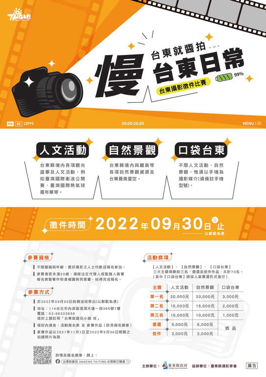 為推廣好山水及慢經濟,臺東縣政府以慢臺東日常為主題,舉辦「臺東就醬拍」攝影徵件活動,廣邀臺灣各地攝影愛好者參與,並設定兩大攝影主題「人文活動類」、「自然景觀類」,以展現臺東特有的文化與景觀,首獎可分獲2萬元獎金,另特別規劃「口袋臺東」主題,鼓勵民眾以隨手可得的攝影媒材,創造社群分享、互動美照,讓臺東旅遊生活美學不設限,並提供優厚獎金鼓勵參與人氣票選,即日起至9月30日截止收件。臺東縣長饒慶鈴表示,臺東是自然資源與生態豐沛的城市、原住民文化底蘊深厚,並有許多精彩的人氣熱門活動。臺東的日常之美、浩瀚之美、驚豔之美、文化之美、夜空中閃爍的美,等著大家用鏡頭記錄捕捉,化為永恆!