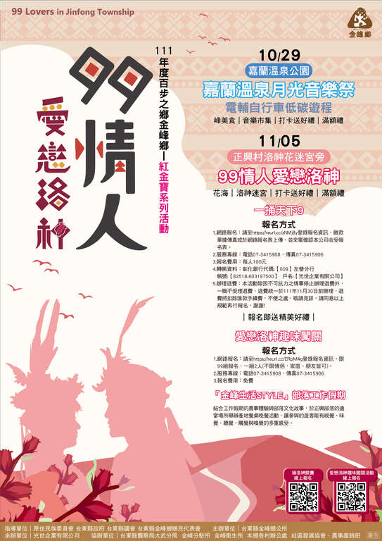 由臺東縣金峰鄉公所主辦的紅金寶系列活動-「 99情人愛戀洛神」,將於111年10月29日以及11月5日登場!!
