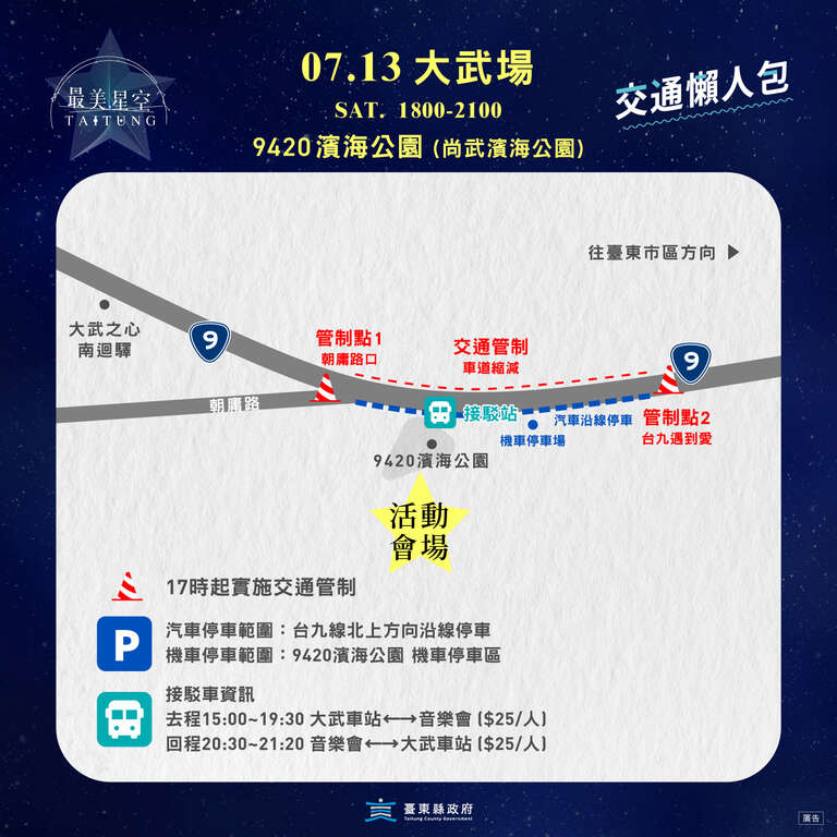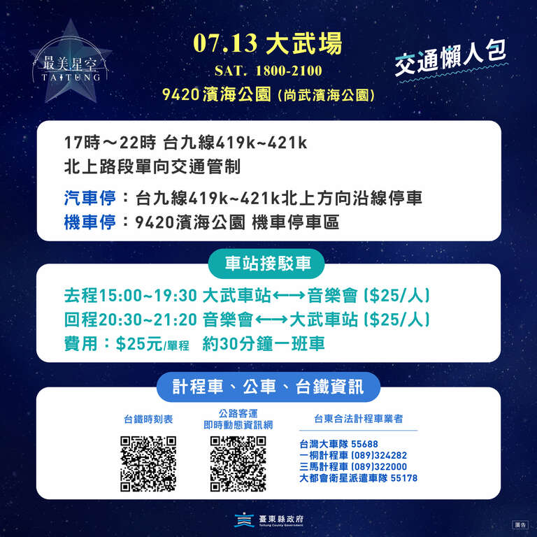 台東縣政府交通及觀光發展處長卜敏正表示,台東最美星空音樂會延續「永續星空品牌」,鼓勵大家搭乘大眾運輸工具,響應低碳旅遊,為方便遊客前往,13日大武場將提供免預約的「大武火車站-9420濱海公園」付費巡迴接駁服務,單趟乘車費用全票為25元,接駁時間自當日下午3點起至晚間9點20分止,另外活動會場周邊道路將於當日下午5點起進行交通管制,會場周邊臺9線北上方向將開放單邊沿線停車。更多活動最新消息請見官方FB或官方IG