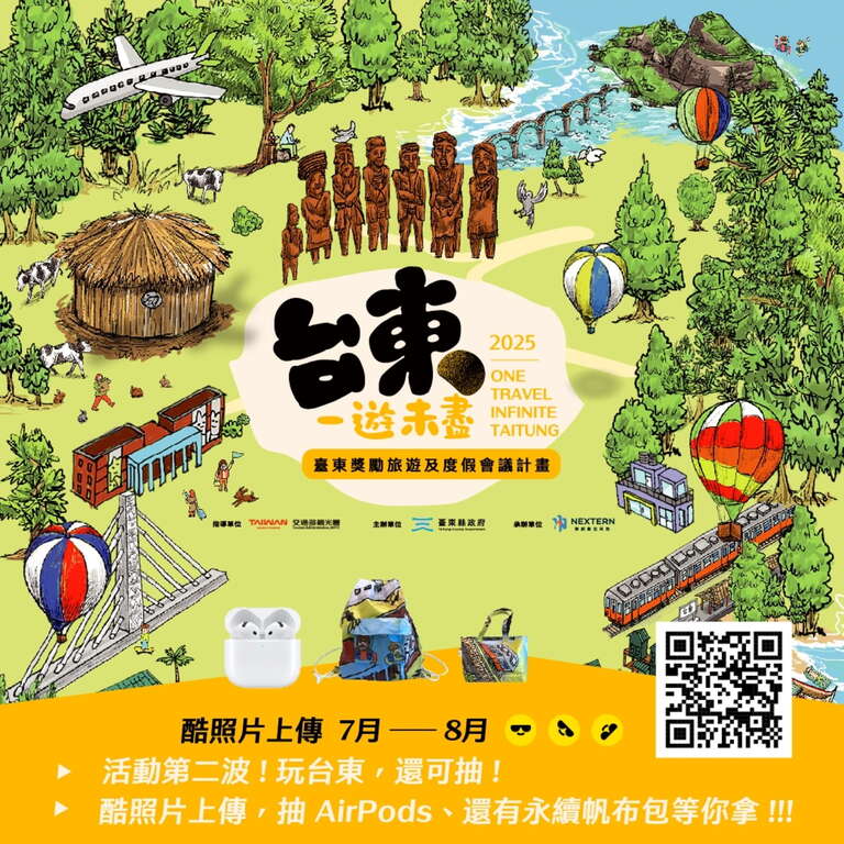 臺東縣政府推出「台東一遊未盡」住宿抽獎送油電車活動,開跑3個月來,吸引近1萬5,000名國內外旅客參與,並獲得在地業者熱情響應,創造近億觀光產值。為延續熱度,臺東縣政府將於7月1日至8月31日推出「酷照片」加碼活動,邀請旅客上傳台東旅遊的美好畫面,就有機會抽中全新AirPods 4及限量製作的台東再製帆布包,為夏日旅程留下精彩回憶。