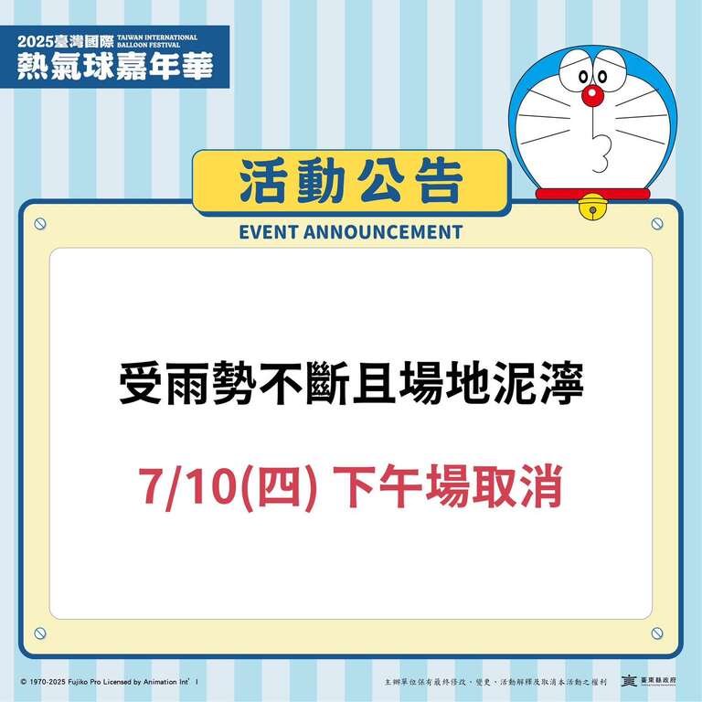 受丹娜絲颱風外圍環流影響,雨勢不斷且場地泥濘,經熱氣球專業飛行團隊審慎評估後,取消7/10(四)下午場活動。