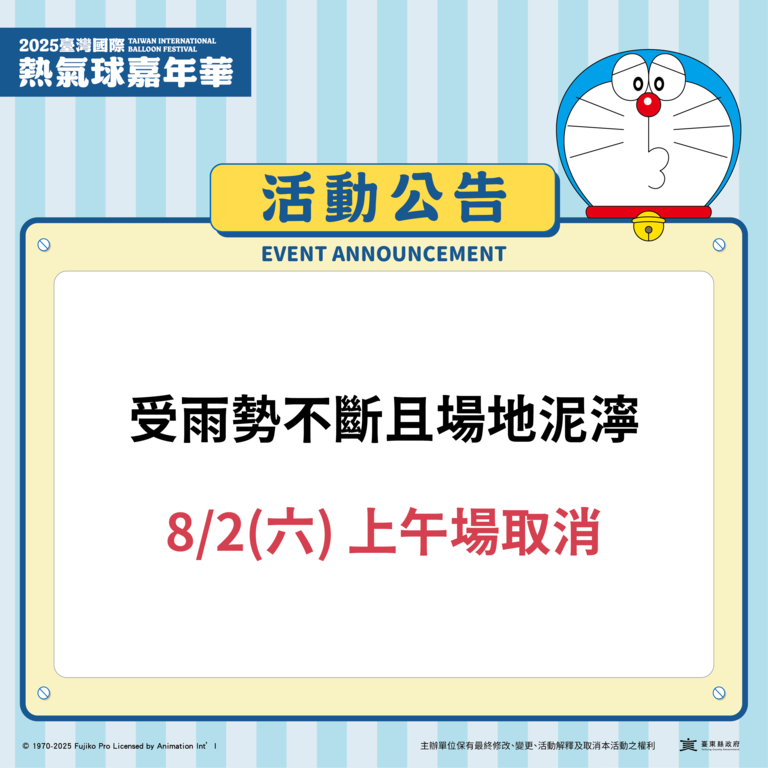 受雨勢不斷且場地積水泥濘,經熱氣球專業飛行團隊審慎評估後,取消8/2(六)上午場活動