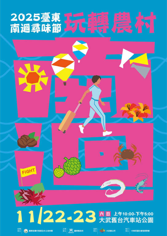 由臺東縣政府主辦的「2025臺東南迴尋味節」,將於11月22、23日在大武舊台汽車站公園繽紛開幕,活動以「南迴遊樂園」為主題,結合山海景緻、在地農產、親子互動與農村文化,以沉浸式體驗、五感市集、親子互動遊戲、競賽活動等,打造一場適合全齡共遊的南迴風味嘉年華,邀請民眾走讀南迴、體驗南迴、愛上南迴。