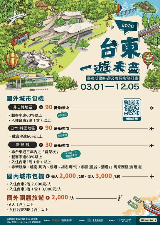 臺東縣政府為吸引國內外遊客赴本縣進行觀光旅遊活動,推出「2026台東一遊未盡」,針對國內外城市包機直航及國外團體旅遊項目推出各式獎勵方案,誠摯邀請大家來臺東探索不一樣的旅行方式,體驗臺東四季皆宜的自然風景與人文魅力!