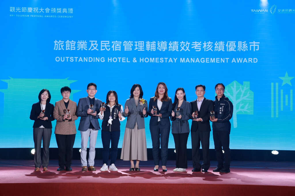 「114年考核地方政府辦理旅宿業務管理輔導績效」獎項,臺東縣政府榮獲最高等第「特優」,交通部觀光署於日前2026觀光節慶祝大會頒發,表彰縣府在旅宿管理制度、查核執行、違規處理及產業輔導等面向的整體成效,由觀光發展處長卜敏正代表領獎。臺東縣政府表示,將結合縣府開發的TTONE,全面提升稽查管理與資料整合能力,保障住宿旅客權益。