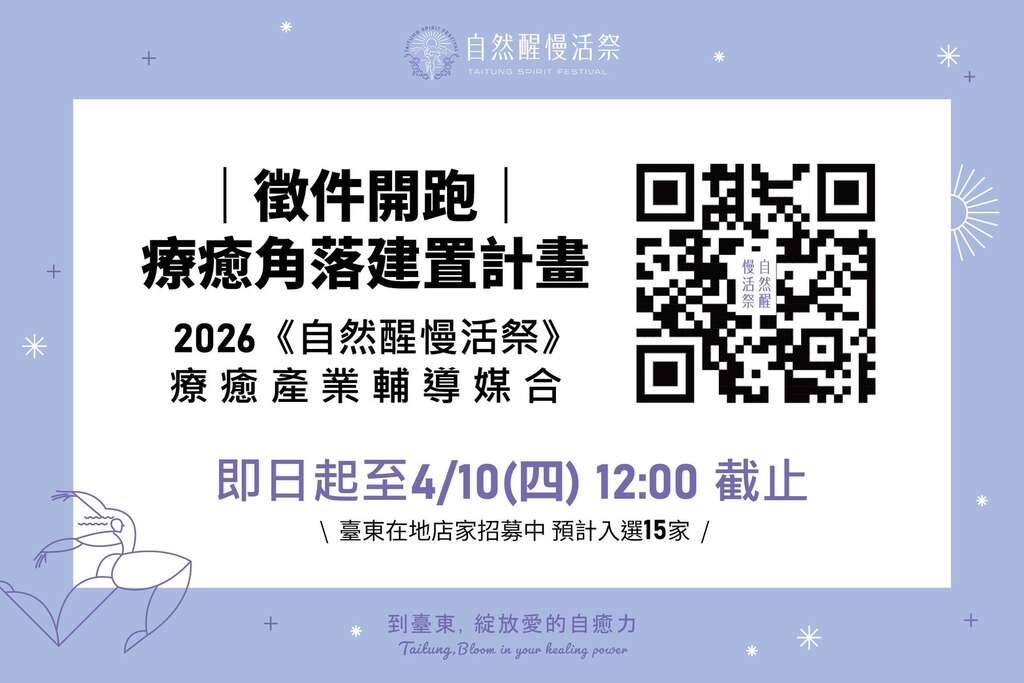 臺東縣政府表示,「療癒角落建置計畫」即日起至4月10日中午12時止受理申請,採電子郵件方式申請,資料請寄:healingnook.taitung@gmail.com ,信件主旨註明「申請2026自然醒慢活祭療癒產業輔導媒合-療癒角落建置計畫-店家名稱」。詳細資訊參閱,報名網址。